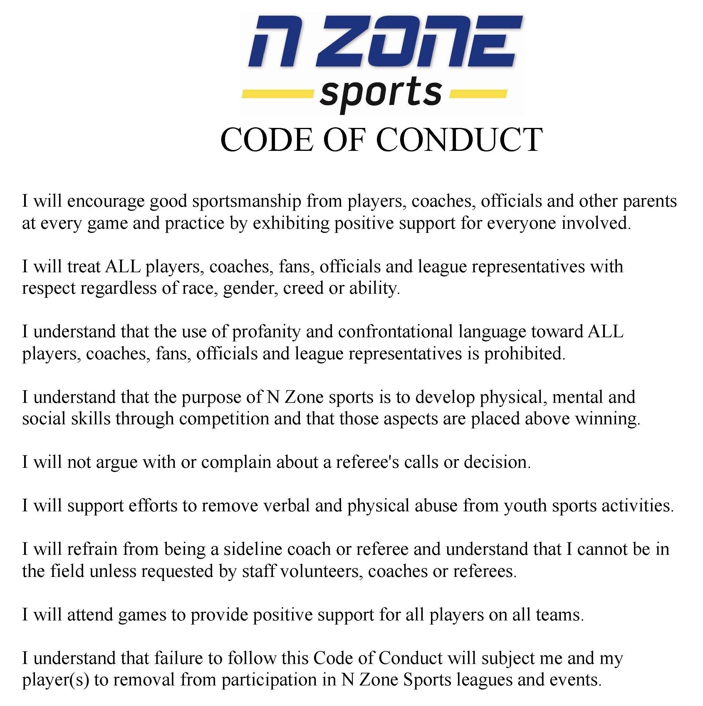 N Zone Sports Grand Valley Code of Conduct