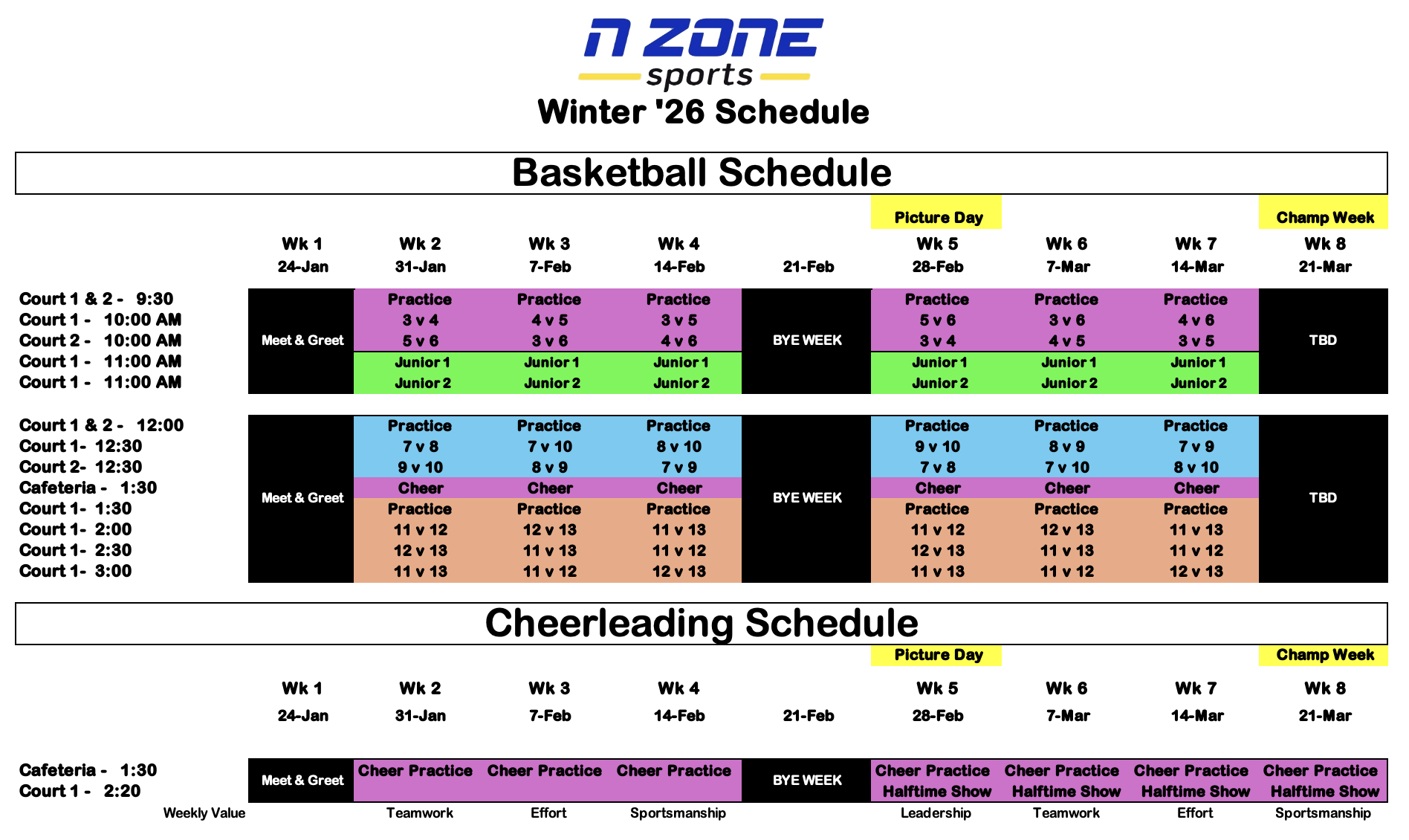 Winter 2026 Weekly Basketball & Cheer Schedule