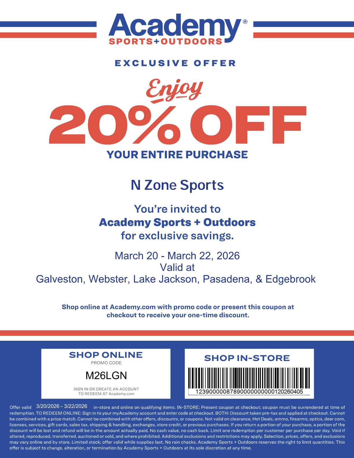 MUST PRESENT COUPON AT TIME OF PURCHASE. Coupon valid Only March 20th, 21st, & 22nd at the following Academy Sports + Outdoors locations: Webster, Pasadena, Edgebrook, Galveston, and Lake Jackson. For ONLINE purchases use code M26LGN
