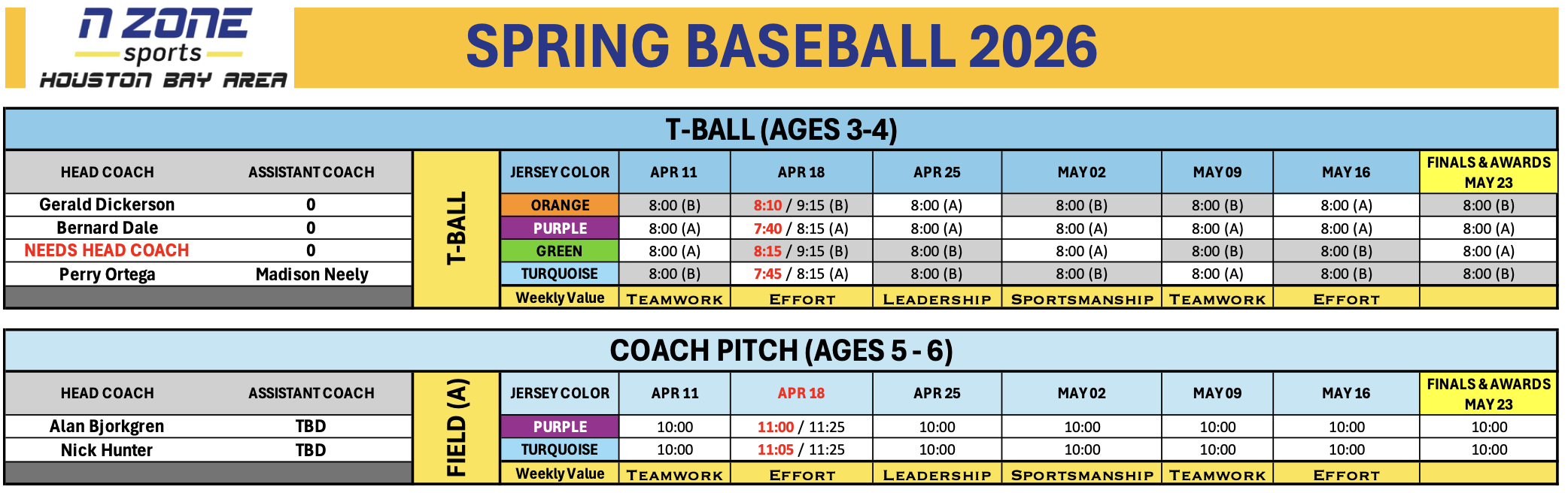 This is the schedule for all T-Ball and Coach Pitch programs at Clear Lake Park for the Spring of 2026