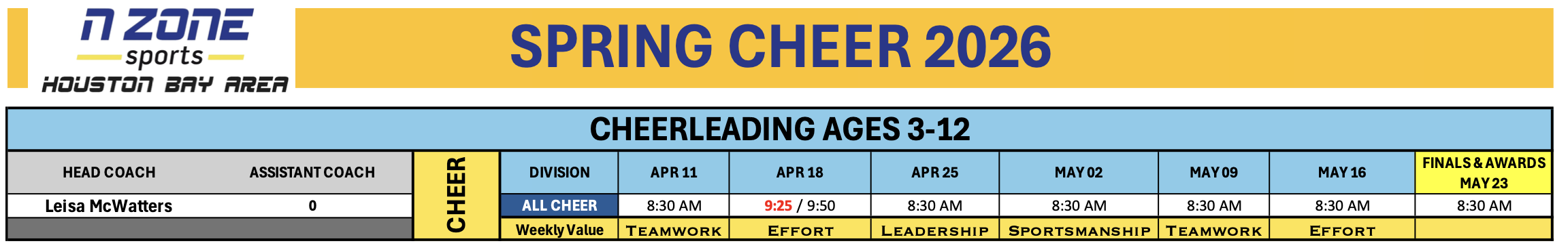 This is the schedule for the N Zone Sports Cheer Program located at Clear Lake Park for Spring 2026