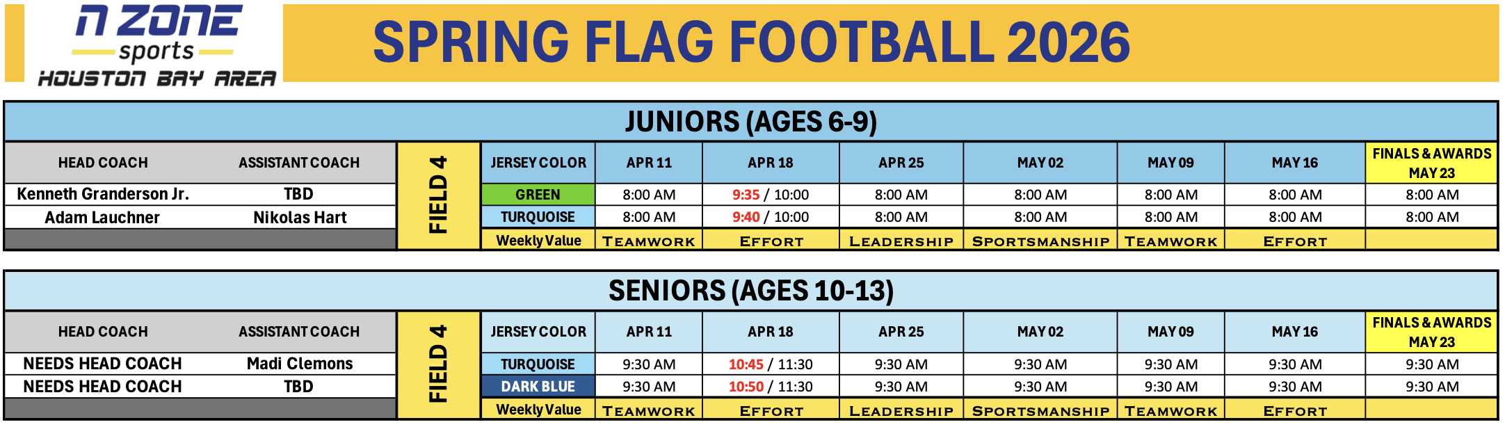 This is the Flag Football Schedule for the Spring 2026 leagues at Clear Lake Park.