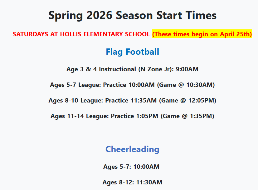 These are the start times for every Saturday of our Spring season starting 4/25/2026