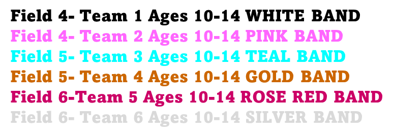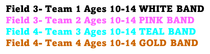 - Come get a colored band from NZone Tent, this will help you find your team and coach faster since fields will be divided by two.
