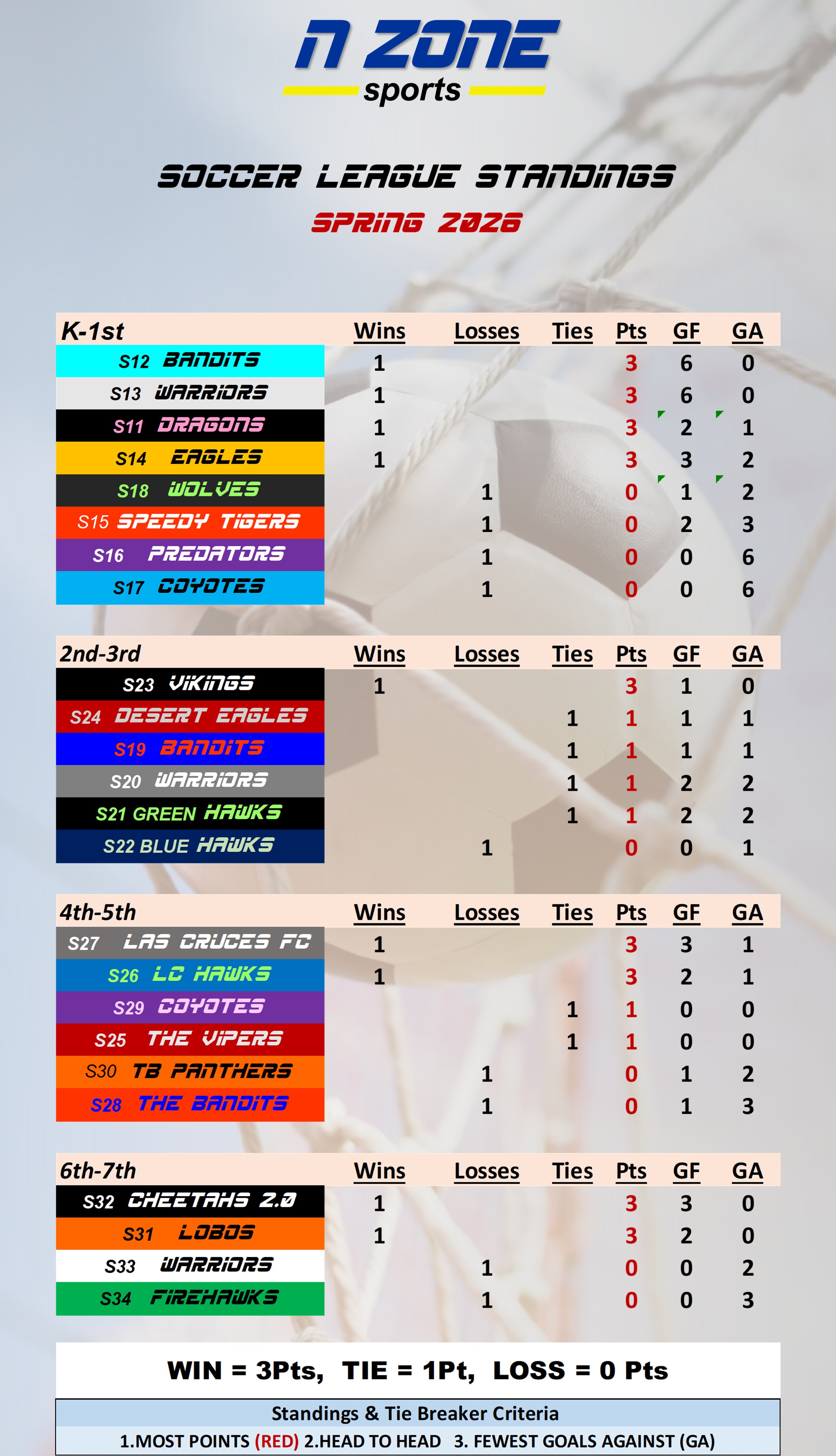 Per the N Zone Soccer Rulebook (pg. 24), it is the responsibility of the winning team’s coach to report the score and verify its accuracy immediately following the game. Standings are updated and posted weekly.