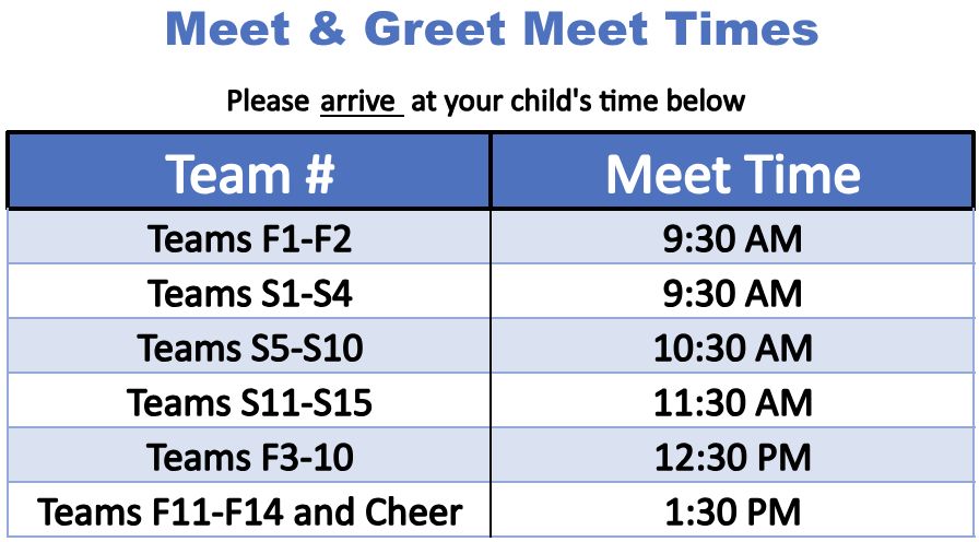 It is important to arrive at your child's meet time listed below. If you are not able to make it to the Meet & Greet for some reason, your coach will have your child's jersey/cheer uniform. You can pick up your uniform at practice the following week from your coach and jump right in.